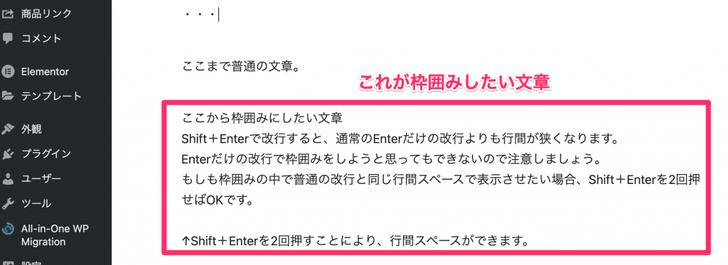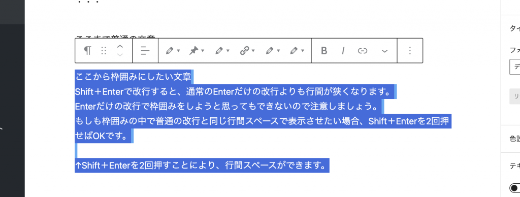 2.枠囲みしたい文章に限っては、Shift+Enterで改行します