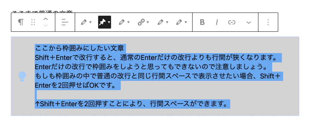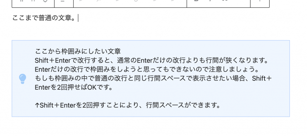 もしも枠囲みの中で普通の改行と同じ行間スペースで表示させたい場合、Shift+Enterを2回押せばOKです。