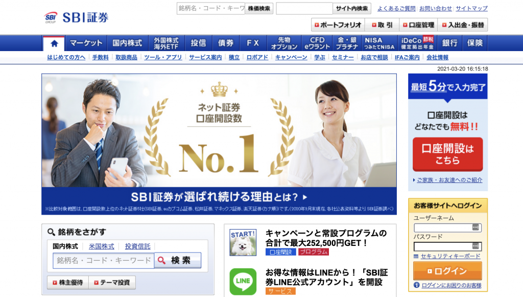 投資信託の取り扱い本数は2000本以上!楽天証券と並んで業界トップクラスです。SBI証券では、投資信託の保有金額に応じてポイントが貯まる「投信マイレージサービス」があります。また、投資するタイミングの自由度が高く、あなたの希望するタイミングで投資がしやすいです。口座開設数が500万を超えており、実績を重視したい方にはオススメの証券会社です。